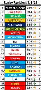 then expected to win but the closer the rankings, the closer the game is expected to be. The current World Rugby rankings as of 5th March 2018 is shown to the right along with their ranking points and the change (if any) from the previous week.