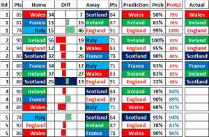 This alternative model does make some sense to me. There has been quite a bit of talk recently that home advantage is becoming more important in the 6 Nations and this chart would appear to confirm that especially when a slightly weaker team plays at home. When the stronger team plays at home, it looks like they are a banker to win but can struggle to put away the weaker teams, perhaps because of high expectations that are difficult to deliver. I have added win probabilities for the stronger team using this model in the PROB2 column in the table above. Note the 3 completed weeks are shown in red since those matches were used to build the model whereas the blue figures are true predictions.