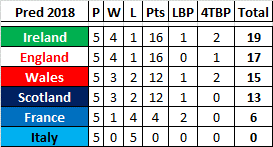 So far, my success rate is 35 correct predictions out of 43 matches involving 6 Nations teams in the 2017 & 2018 6 Nations and the 2017 Autumn Internationals broken down as follows:-