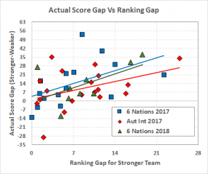 w that I am right 2 out 3 times. This suggests that the figures in the PROB column based on the fitted green bars may not be the best model. Now that I have 43 matches to look at, I decided to look at the correlation between the ranking gap and the actual gap in the scores. The scatter plot below shows the ranking gap for the stronger team on the horizontal axis and the difference in actual scores between the stronger and weaker