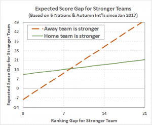 gap is not notably higher. However, when the stronger team plays away with a small ranking gap, the expected score gap is actually negative i.e. the weaker home team is expected to win. Conversely when the ranking gap is large for the stronger away team, they are expected to really put teams away.