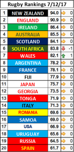 nt ranking and add 3 points to teams playing at home. Whoever has the higher ranking is then expected to win but the closer the rankings, the closer the game is expected to be. The current World Rugby rankings as of 7th December 2017 is shown to the right along with their ranking points and the change (if any) from the previous week.
