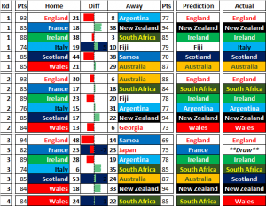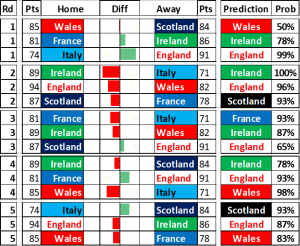 e correct. This table shows the ranking points at the time (adding 3 for home teams) next to each team and the difference between these in the middle (Diff column). The final match score is shown next to the Diff column. The 3 incorrect predictions are shown by blue cells in the Diff column and of these, two were expected to be very close and the 3rd was England’s unsuccessful attempt to wrap up winning the championship with a Grand Slam.