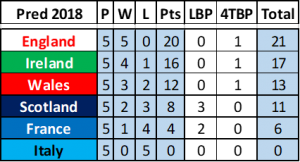 That aside, these predictions are pointing to an England v Ireland grand slam decider in the last week. Of course we now have bonus points as well and whilst I have no grounds for predicting bonus points, I have constructed a provisional league table with the following system. Where the ranking gap is less than 7 points, the expected losing team gets a losing bonus point and where the ranking gap is 14 points or m