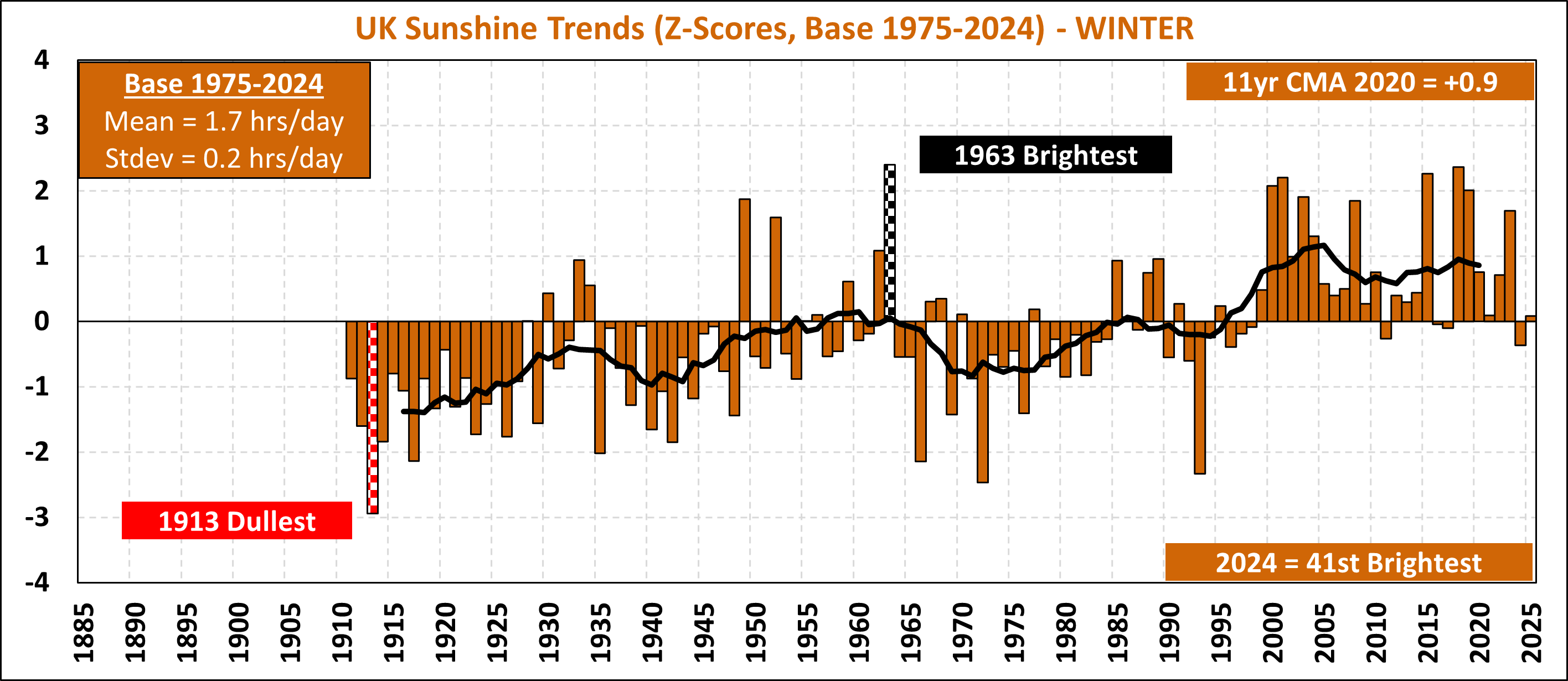 For the winter of 2025, the z-scores for temperature, sunshine and rainfall were respectively +0.6, +0.1 and –0.4. This tells me the season was warmer and drier than usual but otherwise unremarkable.