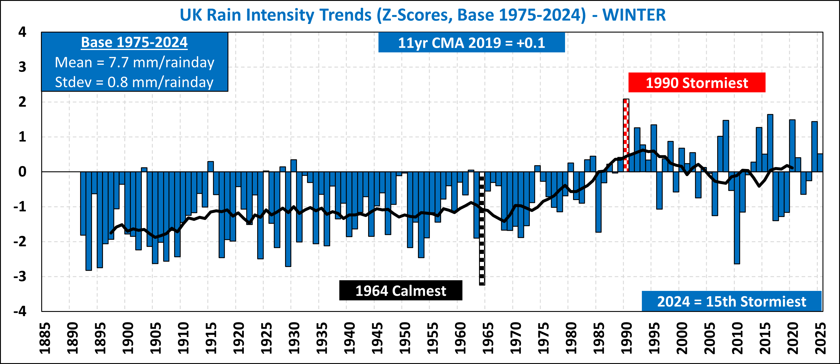 ** NEW as of Spring 2024 – I have added the Z-Score plot for Rain Intensity since the Met Office has released more historical data. Rain Intensity is the average rainfall per rainy day as opposed to rainfall per day shown in the Rainfall chart. I use this variable as a proxy for how stormy or calm the weather has been. For now, I do not include rain intensity in my analysis of long term trends.