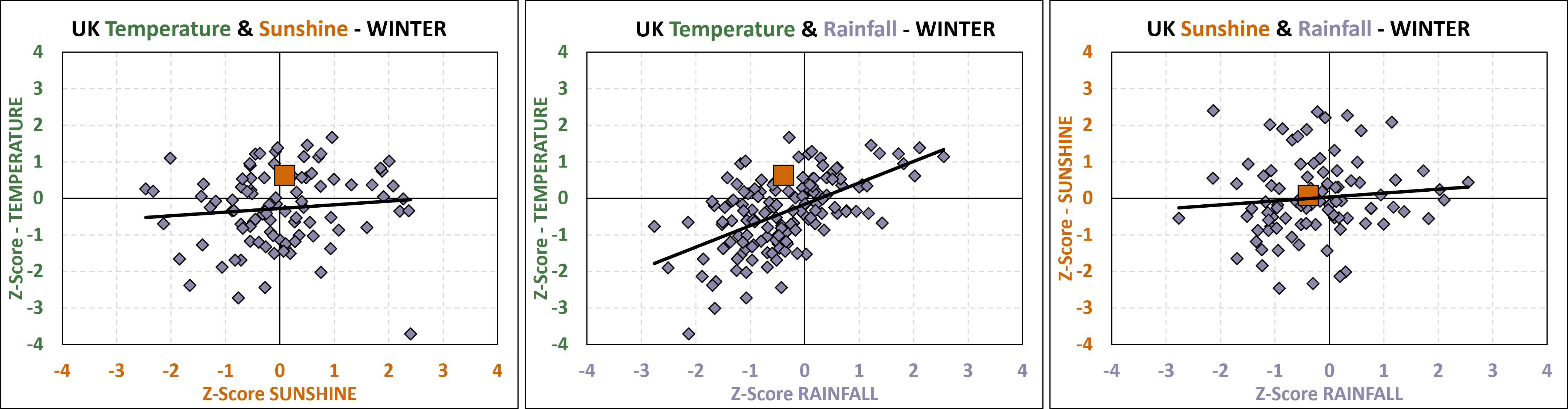 The long term trends chart above suggests the z-scores for temperature, sunshine and rainfall appear to be correlated. This can be illusory as the above chart uses moving averages. If we look at the actual z-scores, we can see what the actual correlations are in the 3 scatter plots below.